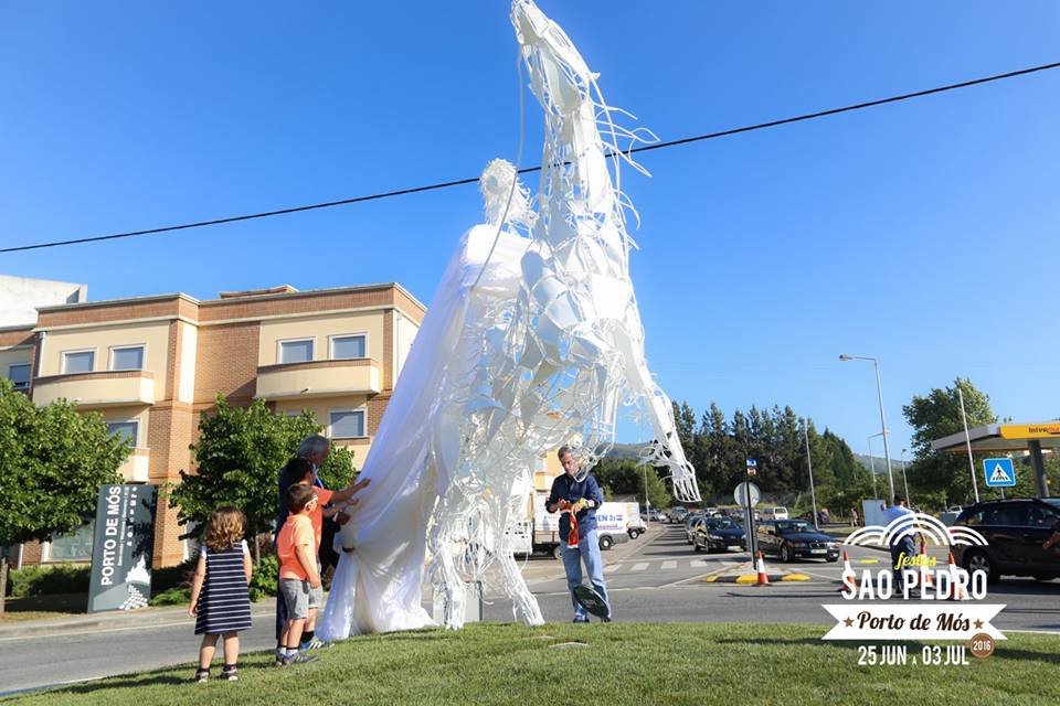 Inaugurada em 2016, a escultura celebra Dom Fuas Roupinho, alcaide de Porto de Mós, reconhecido por sua liderança durante a Reconquista Cristã no século XII. A escolha do ferro como material e o estilo artístico simbolizam o caráter lendário desta figura histórica. Localizada numa rotunda central, a peça tornou-se rapidamente um marco cultural e turístico da cidade.